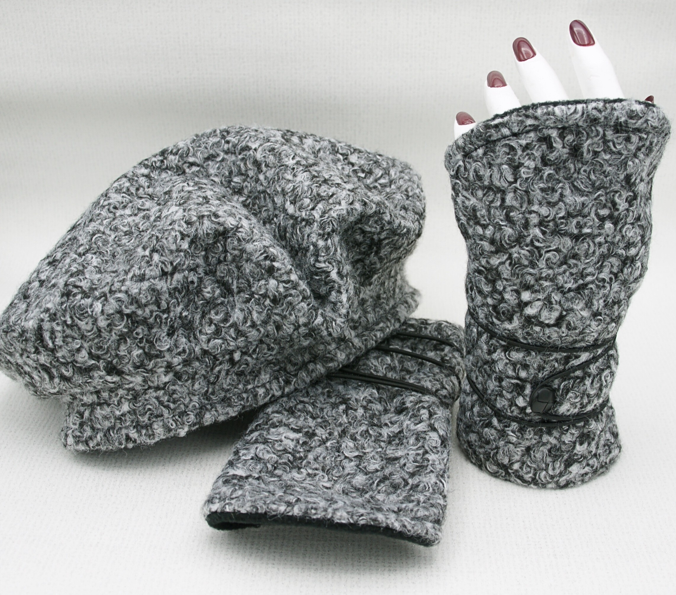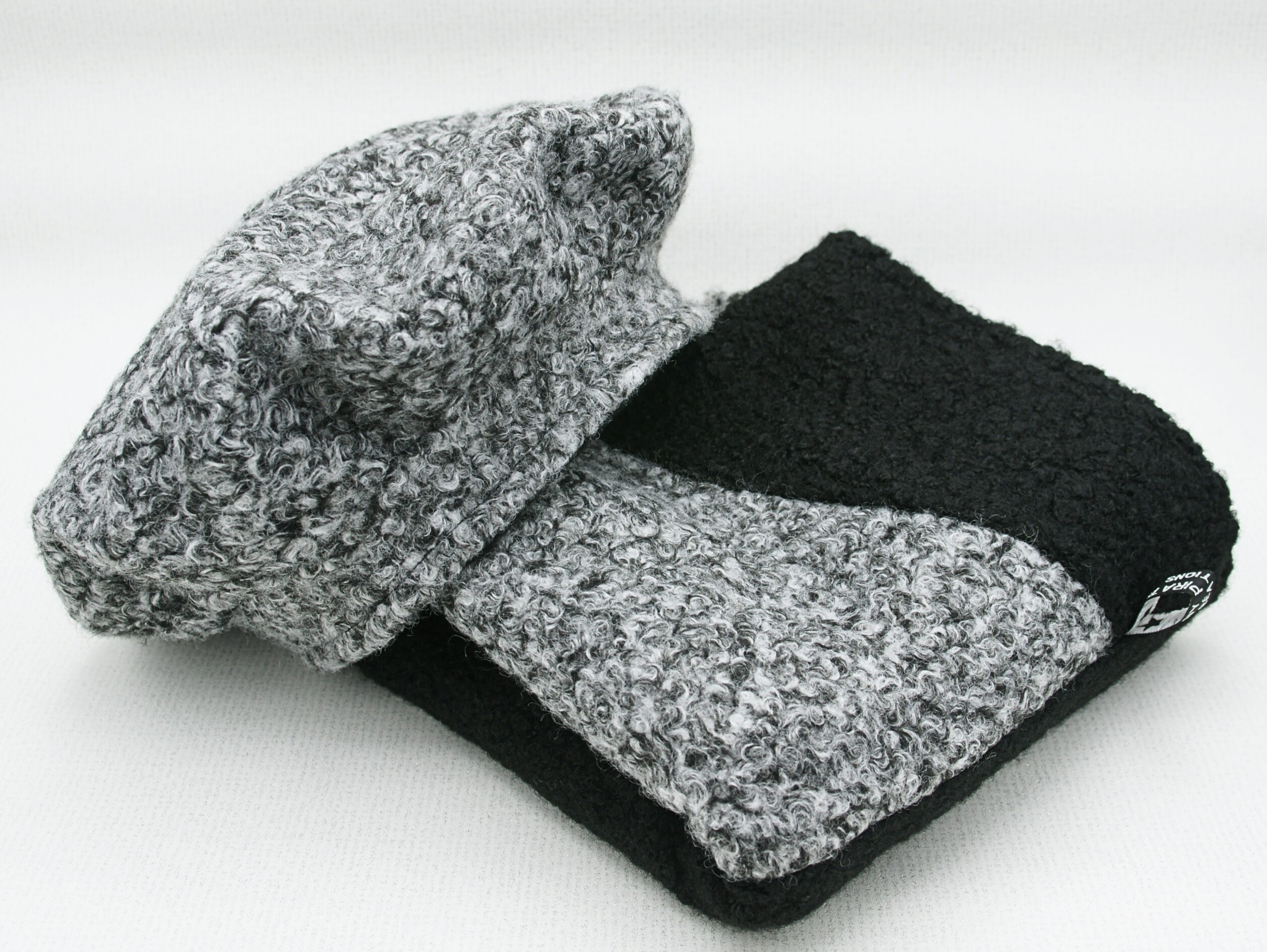 Douillet et léger, il est réalisé en lainage "bouclette" gris chiné noir, et doublé de polaire noir pour le plein de douceur.