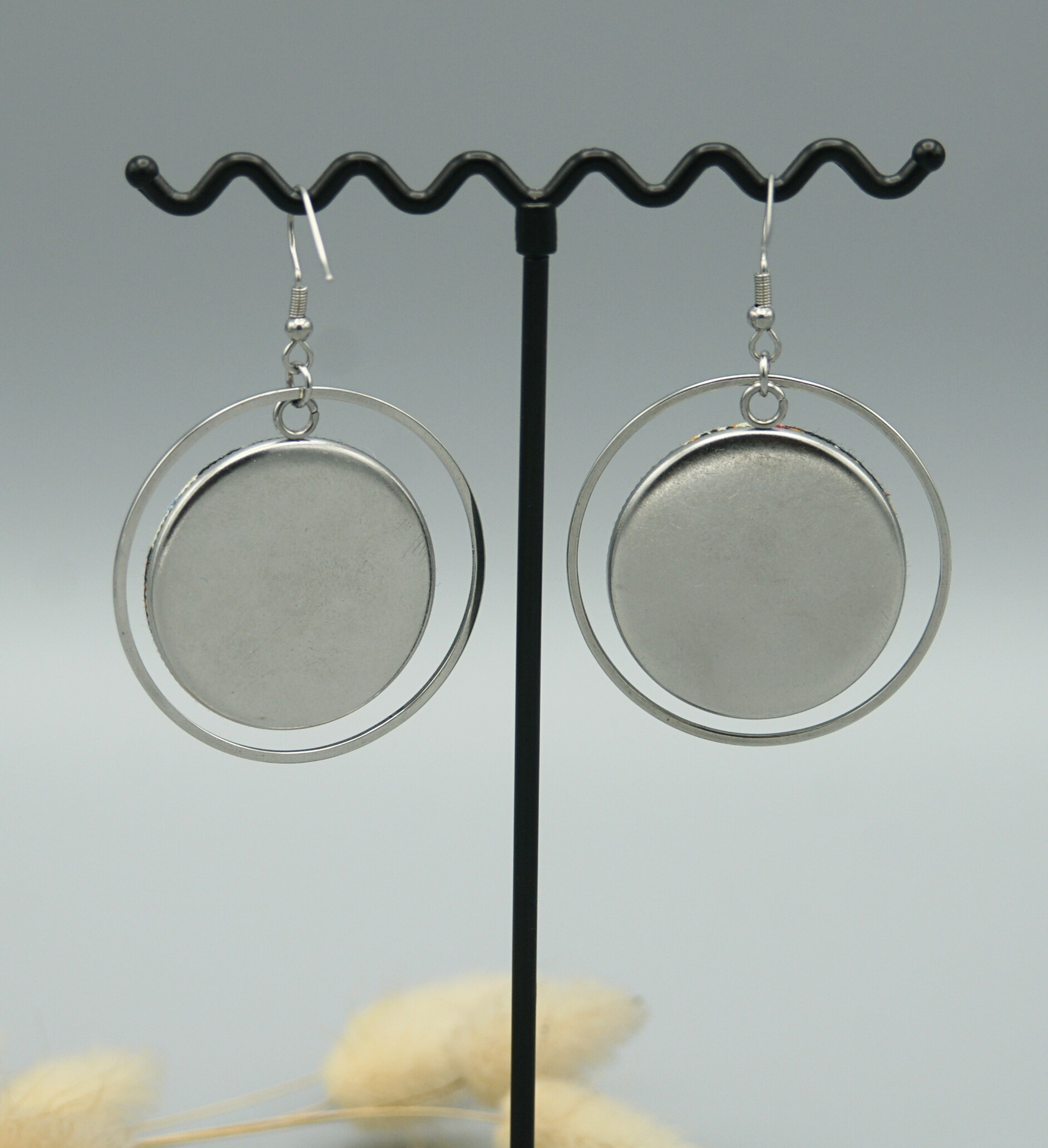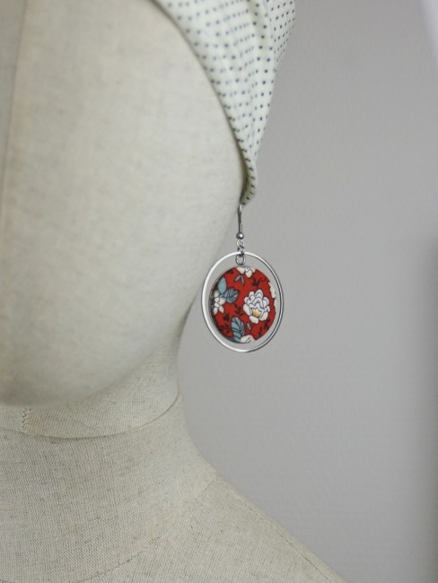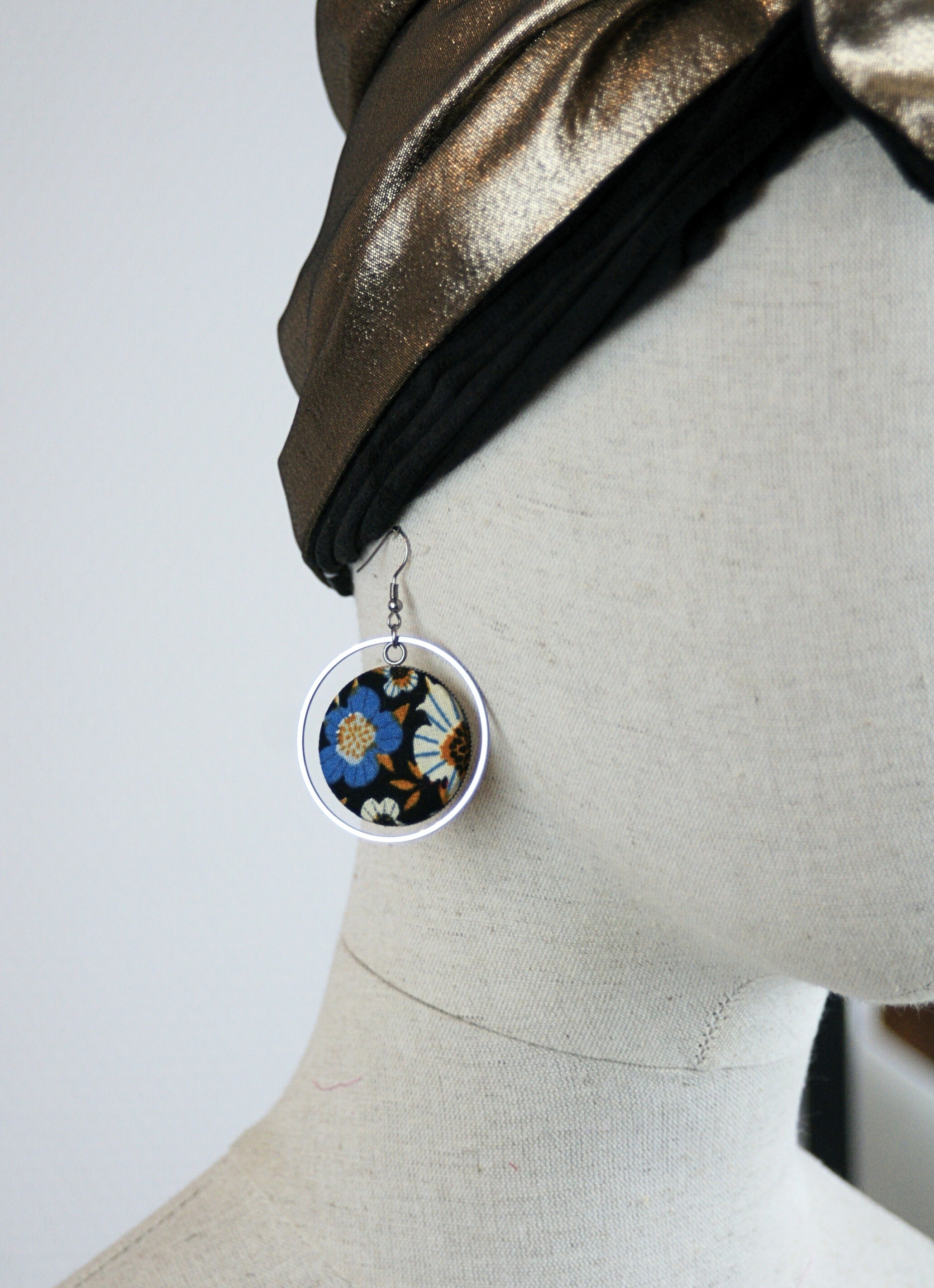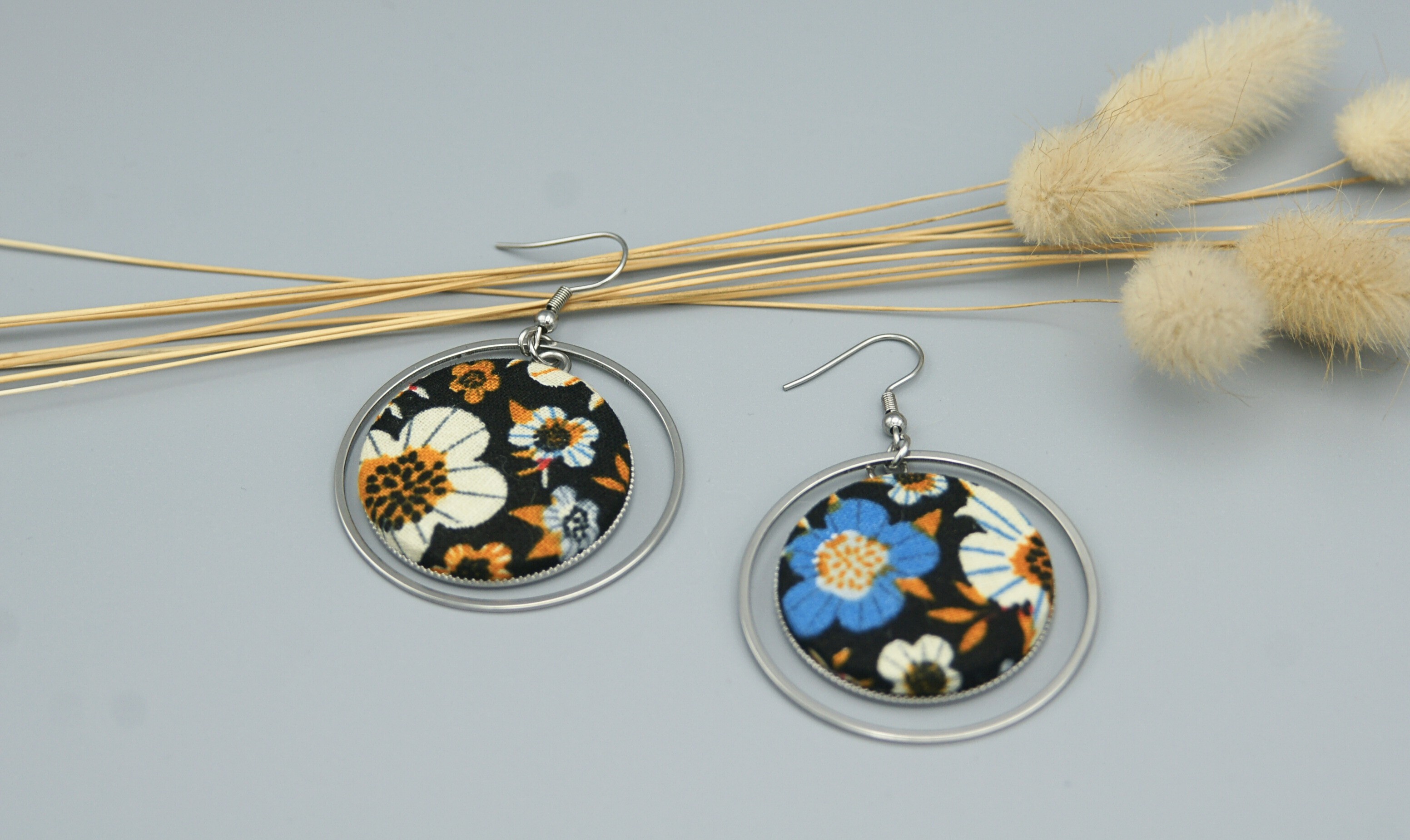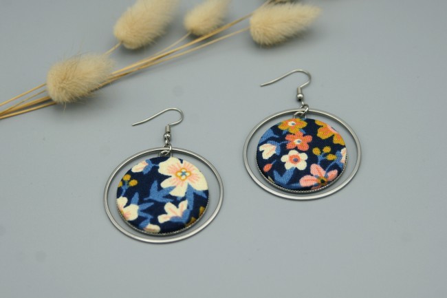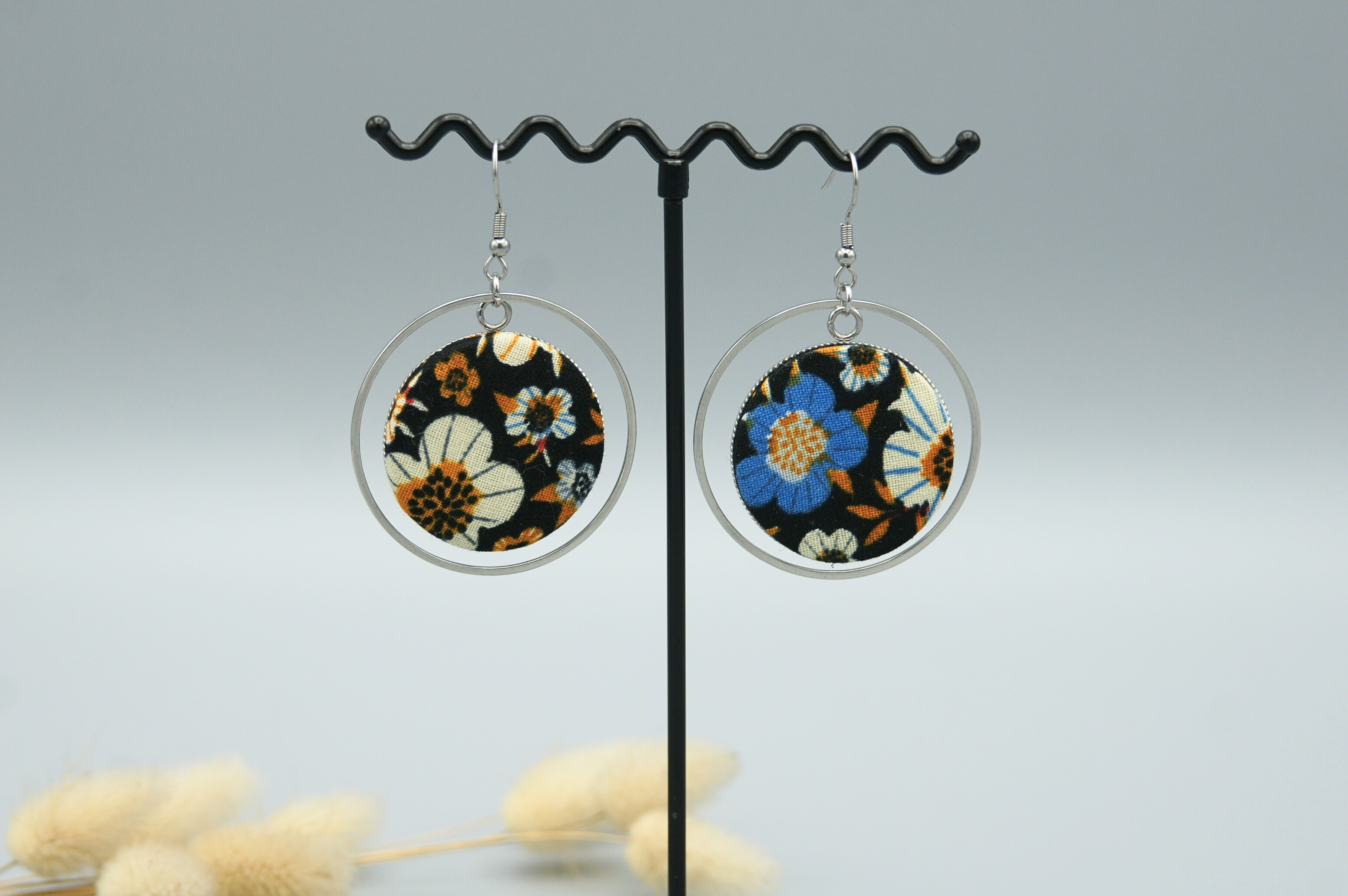 Le pendant est composé d'un cabochon de coton à petites fleurs à l'esprit rétro, dans les tons bleu / blanc / orange sur fond noir, serti sur un support en acier inoxydable. Un anneau en acier inoxydable vient entourer le pendentif et lui donner du mouvement. L'ensemble est monté sur un crochet pour oreilles percées, en acier inoxydable également.